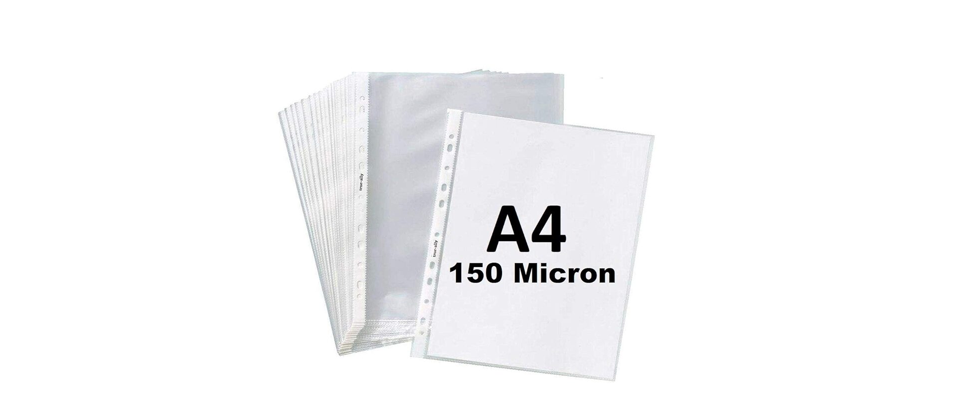 Clear A4 size sheet protectors (150 micron, pack of 50) made from durable transparent plastic to safeguard documents from dust, spills, and wear. Pre-punched holes allow easy insertion into ring files and binders, ideal for office, school, and home filing.